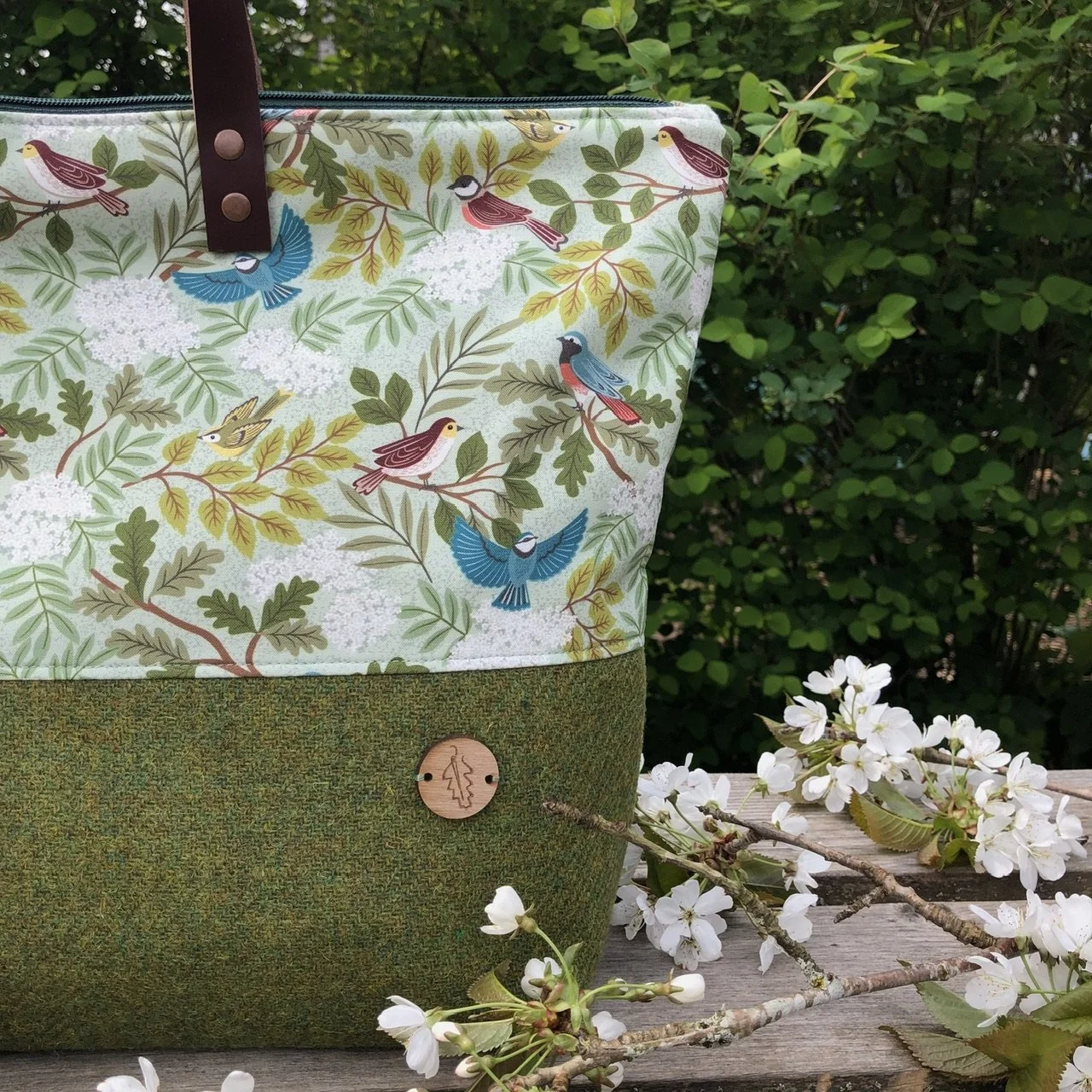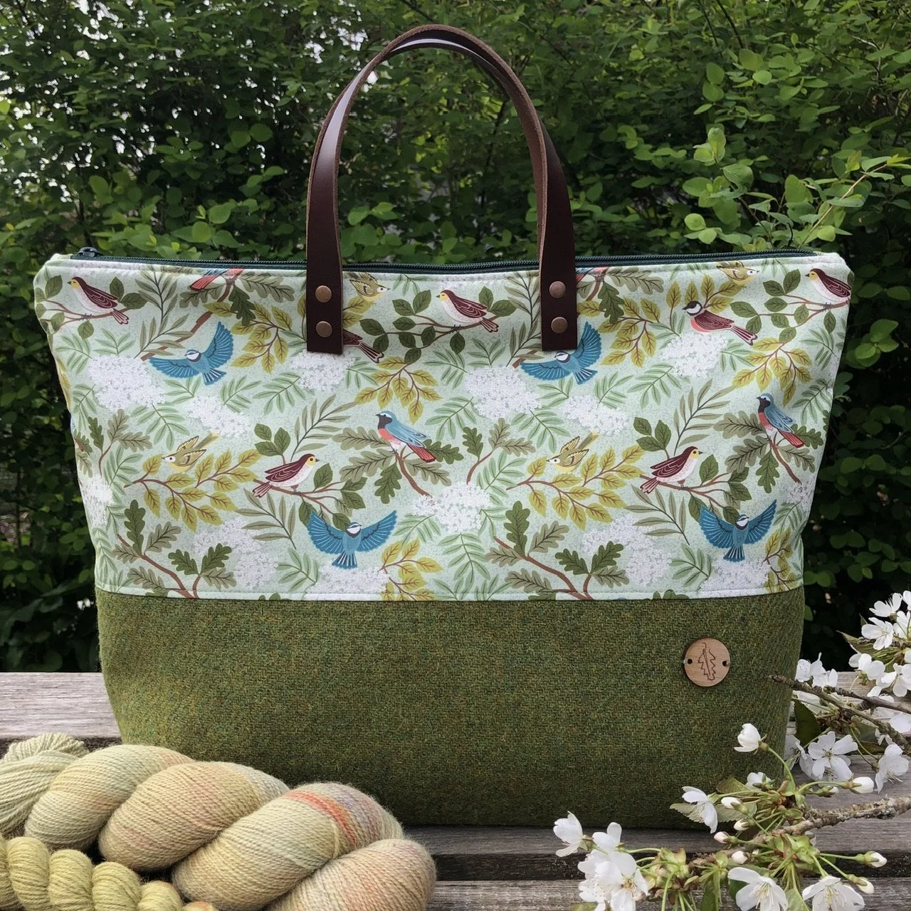 A sweater size project bag with a beautiful spring print and green Harris Tweed.