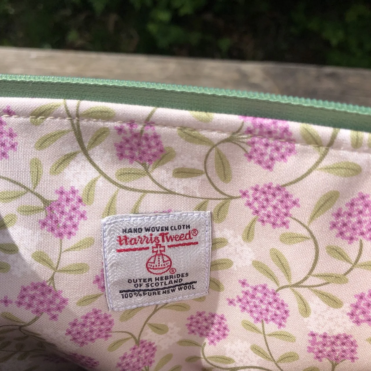 Materials - Harris Tweed and cotton exterior, cotton lining, cotton/soy batting and woven cotton fusible interfacing, nylon zip, wooden button and a Harris Tweed Authority label (this is made from polyester fibres).